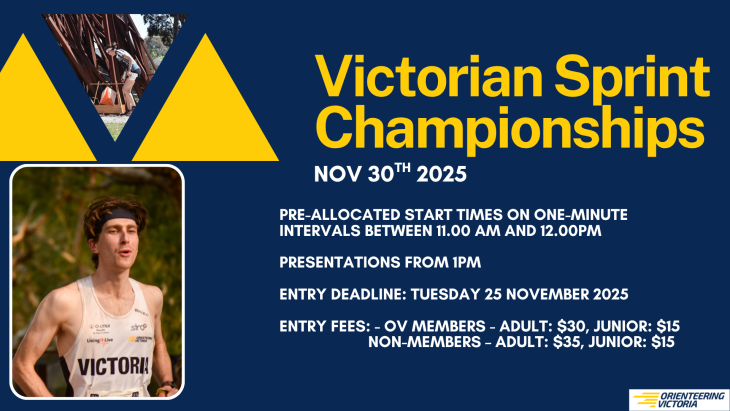 2025 Victorian Sprint Champs Results and Photos Congratulations to the 2025 winners of the Cavill Cups – Angus Haines and Milla Key, who took out M21 and W21 at the Victorian Sprint Championships at RMIT Bundoora. Congratulations also to all the age group Sprint Champions and placegetters. Results, Splits, Livelox A huge well done to Yarra Valley Orienteering Club for getting through a very testing day, with frequent showers and wind gusts playing havoc with tents and soaking everyone. The mass start race held after the main event was a frantic scramble to be first over the line, with Neo Kozma ultimately winning the giant Toblerone. Thanks to Joe Hudd who planned the courses, making extensive use of artificial barriers to provide route choices in the open parkland west of the campus, and making us think differently. Check out these great photos taken by Lincoln Paterson. Share this
