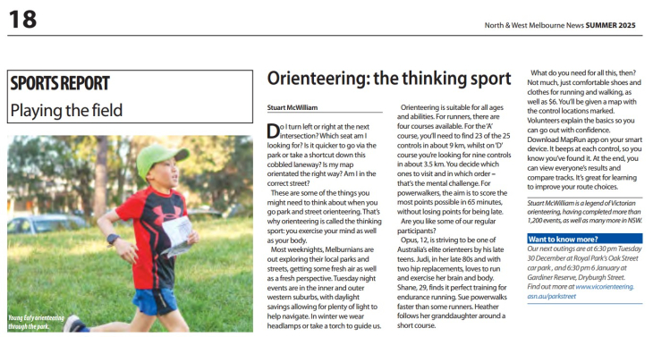 Park Street Orienteering Making Headlines Thanks to Stuart McWilliam, who contributed this great article to the North & West Melbourne News Summer 2025 issue! It has already paid off with newcomers at Royal Park this week. Click here to read the article in pdf format (pg 18) Share this