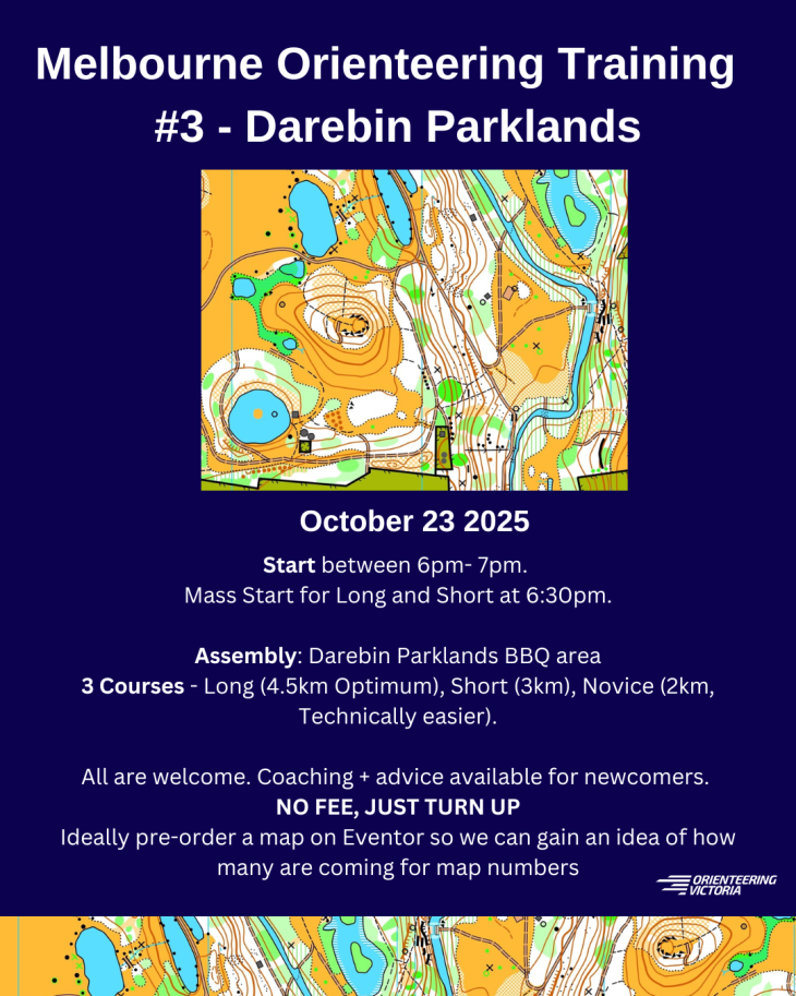 Training With Joe, Thursday 23 October, Darebin Parklands Everyone is invited to Joe’s next training session, on Thursday 23 October at Darebin Parklands, from 6pm. Training is free – simply come along and learn some new skills! Please put your name down in Eventor, for map printing purposes. Entries close 22 October Share this